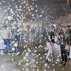 Delicate bubbles filled with mist drift through the air, creating a surreal and enchanting effect that captivates guests and enhances photos.