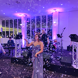A whimsical shower of bubbles floats through the air, adding a dreamy, romantic touch to ceremonies, first dances, and photo moments.